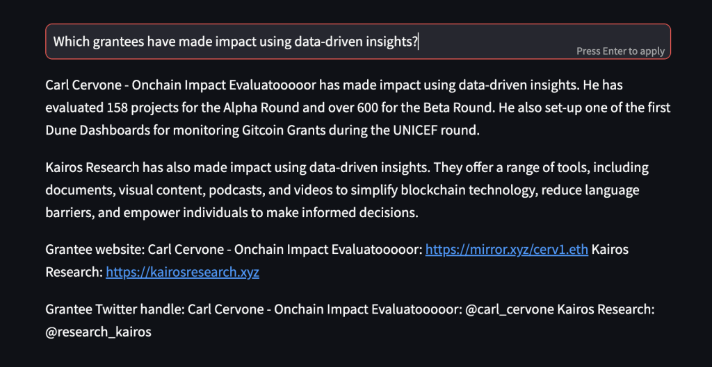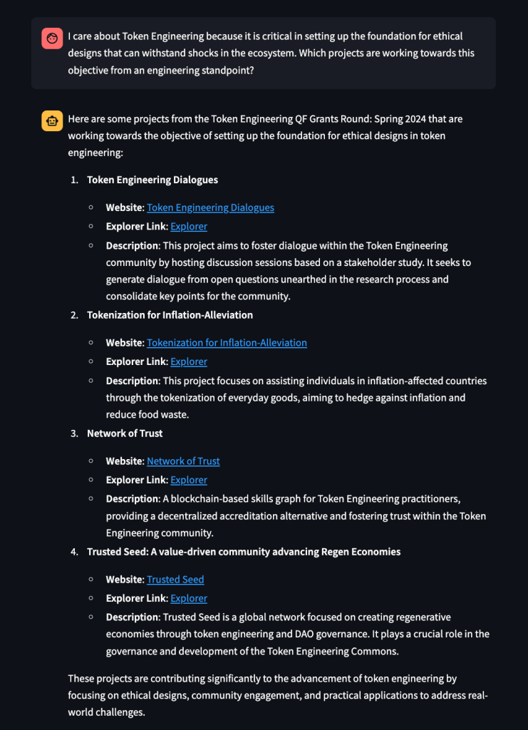 A ChatGPT-like experience (with conversational memory) to explore 80+ grantees in the climate round of GG18, with new feature for capturing user feedback. The app can be used to write a Twitter thread for your project, interact in language of your choice, seek clarification for a grantee’s work, and explore projects by topics of your interest.