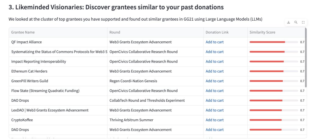 One-click personalized grantee recommendations to re-discover the grantees you’ve supported in the past, explore grantees backed by the community who also champion your favorite projects, and uncover similar but previously unknown grantees – see example.